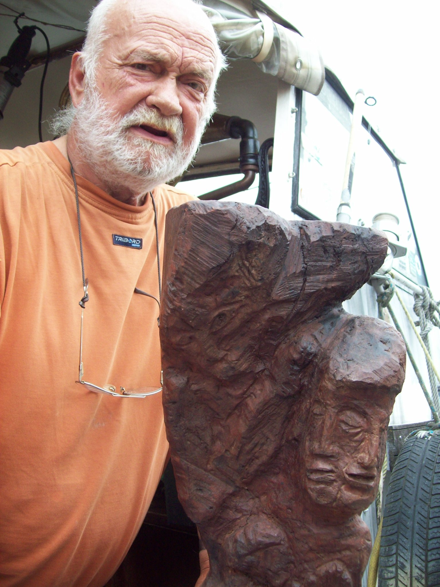 Vu de la berge, le bateau de Philippe Jarry, c’est celui dont l’arrière est prétexte à amoncellement d’objets tous formats: on dirait le coffre ou le toit d’une 2C.V. un jour de départ en très grandes vacances. De plus près, ça se révèle être des sculptures sur bois, sur pierre. On hèle le patron du Hamlet: il émerge, barbe à la Hubert Reeves ou, au moins, Hemingway, regard Victor-Hugolien-de-la-maturité. « Bienvenue sur la galère! Moi je suis sur la galère. »