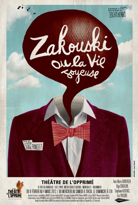 Quatre comédiens pour 18 personnages (ouvrier, milicien, balayeuse, popesse .. .) et 23 tableaux (tramway, église, cinéma, tribunal…), qui s’animent aux fenêtres d’un castelet ambulant au théâtre de la vie, c’est une prouesse digne d’être saluée. Zakouski signifie « petits fours ». Gageons que ce spectacle mis en scène avec bonheur et simplicité par Serge PONCELET, ne fera pas un four et sera apprécié aussi bien par les mômes que par des adultes touchés d’être dragués par un peintre aux couleurs chaudes et tendres, Mikhaïl ZOCHTCHENKO car se diluent dans l’‘œil, pour notre plus grand plaisir, des parfums de CHAGALL, SOUTINE ou du DOUANIER ROUSSEAU.