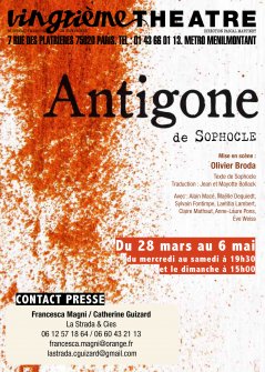 La scénographie à la fois sobre et éloquente fait penser à celle d’un peintre qui exposerait un triptyque formé par le chœur, Antigone et Créon. Antigone jouée par Laetitia LAMBERT possède toute la juvénilité, la vigueur et la beauté que l’on peut rêver pour un tel personnage.