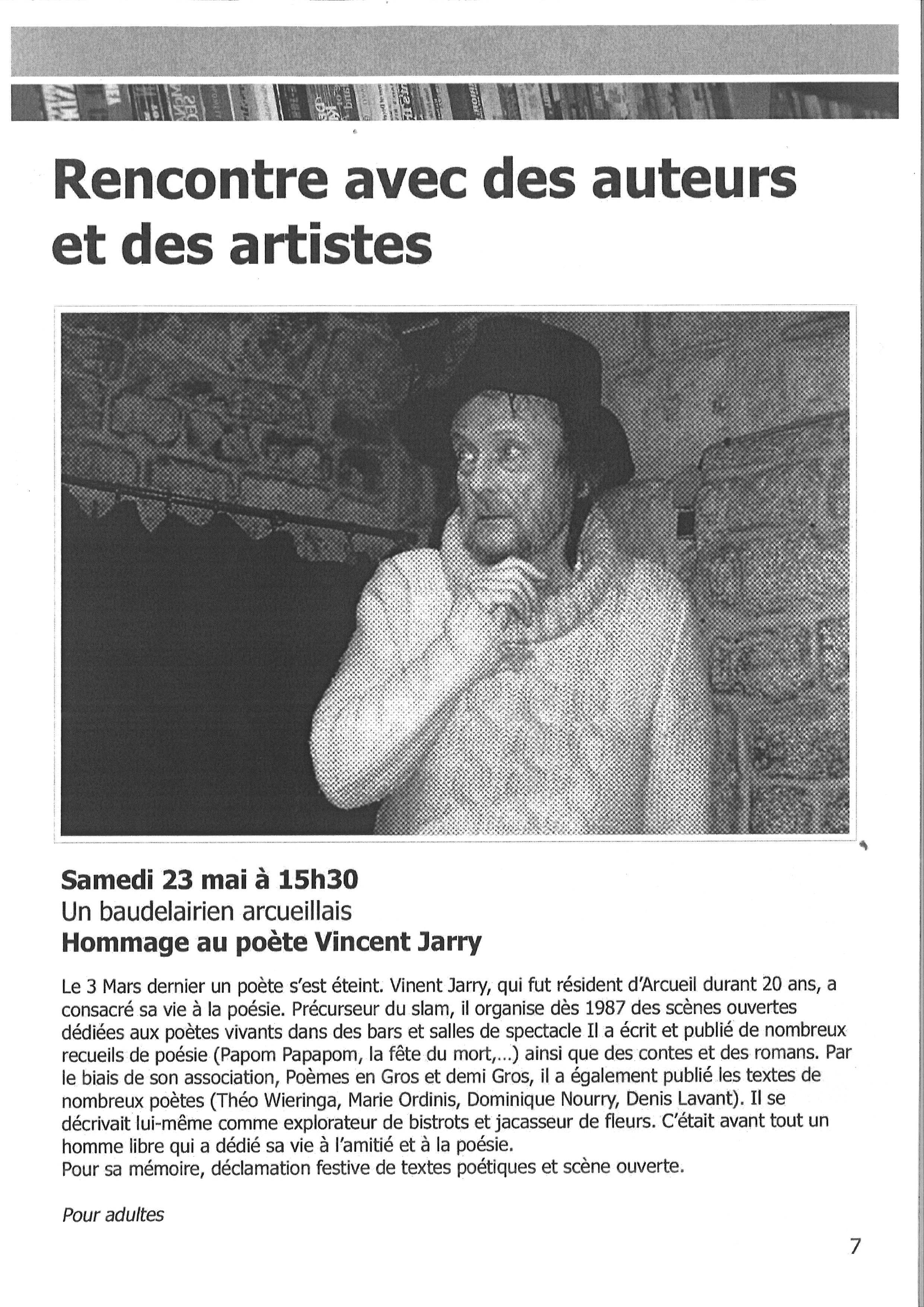 Je suis très émue par cette belle initiative de Samuel JARRY, le fils de Vincent JARRY. J’ai rencontré Vincent en 2003 grâce à Jean-Marie Blanche. Je m’en souviendrai toujours, car ce jour là fût aussi mon baptème de scène tout à fait à l’improviste pour moi. Tous les derniers dimanches du mois, « Les Fous du vocal » venaient « déclamer » leurs poèmes sur la scène du Théâtre Noir du Lucernaire . Il y avait aussi des spectacles programmés et à cette occasion, j’ai entendu Denis LAVANT dire les poèmes de Vincent. L’atmosphère était fièvreuse et hyper conviviale. A l’entracte, ‘les poètes » se retrouvaient autour d’un verre et des sandwiches. Je me souviens encore des discussions avec Guy PERROT et Yael, interprètes notamment de son feuilleton radiophonique « Des belles rencontres entre la Princesse Panthère Douce et l’Aède le Gland» et aussi du chagrin de Vincent à la mort de Yael dont il a publié les poèmes http://yael.et.vous.free.fr/eclats/
