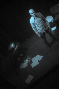Est-il possible de faire retentir le bruit de la solitude ? L’auteur semble vouloir atteindre le la d’une solitude qui se peuple progressivement de toutes sortes de souvenirs. Tout d’abord c’est une voix off qui tire le rideau de la pénombre où l’on voit se mouvoir un homme devenu une ombre. Cette voix off se dresse comme un mur de paroles, impassible, monocorde qui contraste avec la vision d’un homme quelconque, juste une silhouette.