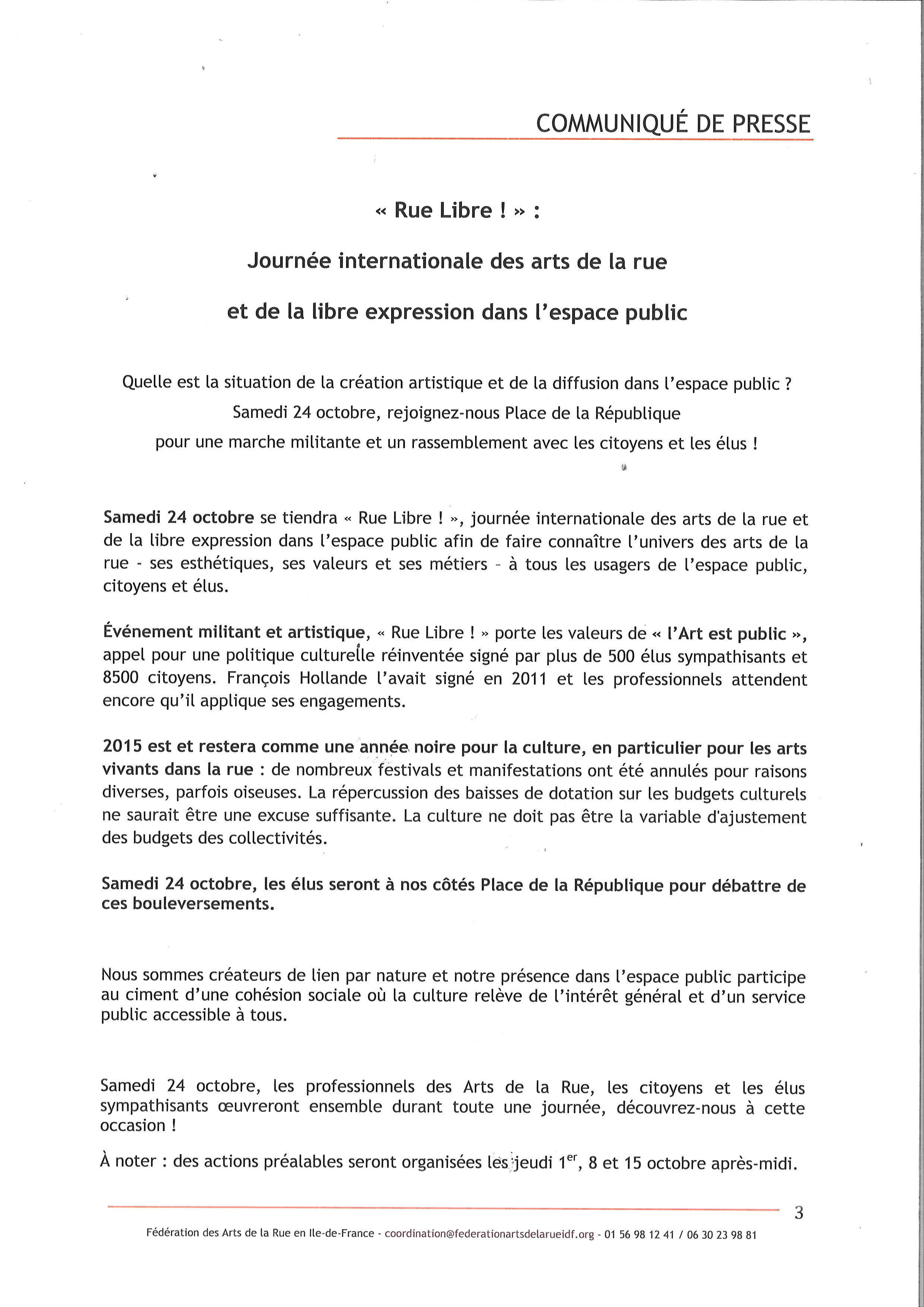 JOURNEE INTERNATIONALE DES ARTS DE LA RUE ET DE LA LIBRE EXPRESSION DANS L’ESPACE PUBLIC – DEAMBULATION MANIFESTIVE LE SAMEDI 24 OCTOBRE 2015 A PARTIR DE 14 HEURES PLACE DE LA REPUBLIQUE A PARIS