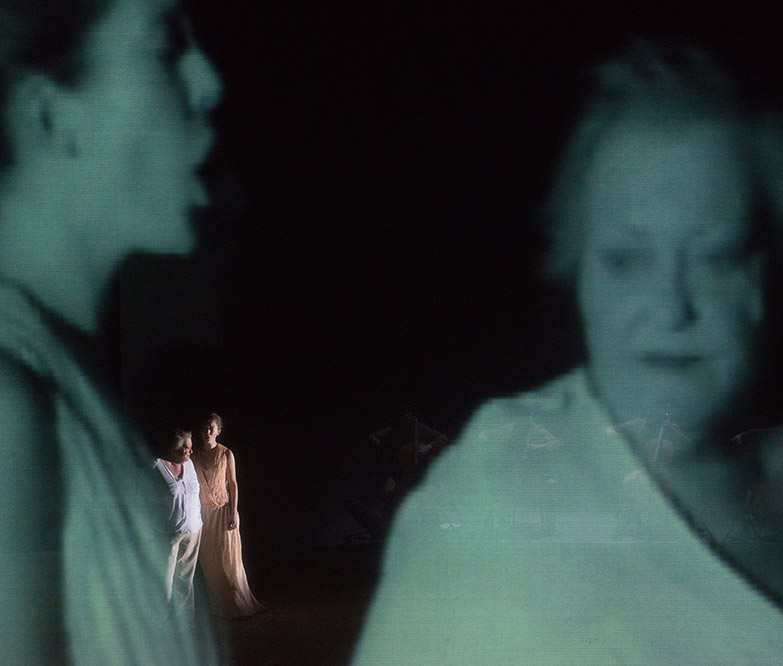 Fabrice MURGIA développe des images oniriques à travers des rideaux de captations vidéos, des effets d’apparitions, disparitions qui enveloppent concrètement les musiciens et la comédienne.