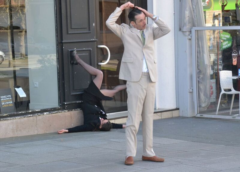 La compagnie VOLUBILIS enchaîne huit performances dansées, chorégraphiées par Agnès Pelletier, qui ont la particularité de se fondre dans le paysage urbain, tant et si bien que les spectateurs qui suivent les pérégrinations des comédiens danseurs devant la vitrine d’un coiffeur, une fontaine, ou la place de l’hôtel de ville, etc., voient bien que la vie ne s’arrête pas pour autant. Il y a et oui des personnes qui sortent de la mairie sans même jeter un coup aux ébats comiques de jeunes mariés sur le perron !