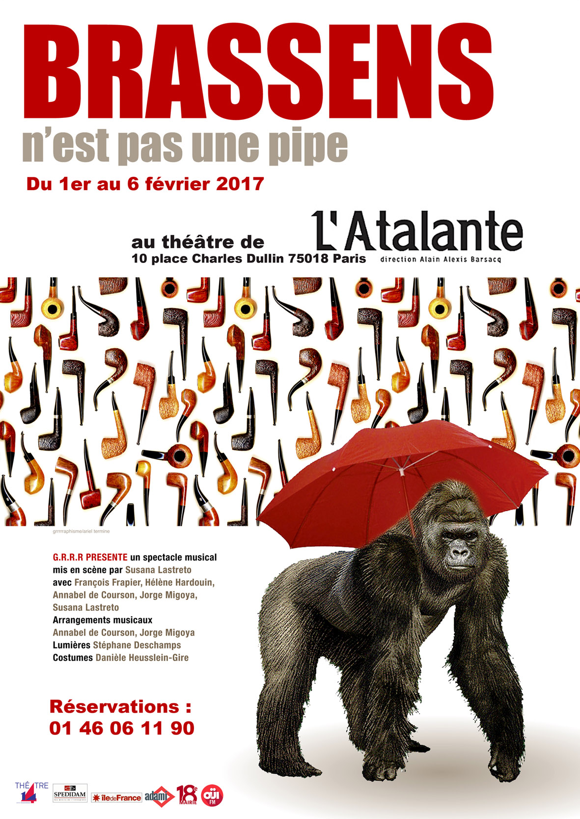 Nom d’une pipe, Brassens, Georges B. si vous préférez, ne finira jamais de nous étonner ! « J’étais né pour devenir un arbre « disait-il. L’arbre n’a pas fini de fleurir, Brassens est chanté dans toutes les langues du monde mais il se moque bien d’être respecté. La Compagnie GRRR implantée dans le 14ème arrondissement ne hume pas seulement l’air où Brassens a vécu, elle s’en parfume avec humour.
