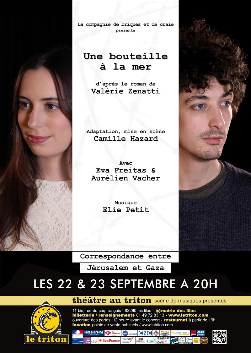Une bouteille dans la mer de Gaza de Valérie ZENATTI- Adaptation et mise en scène de Camille HAZARD – Vendredi 22 septembre; samedi 23 septembre à 20h00. Le Triton – 11 Bis rue du Coq français 93260 LES LILAS –