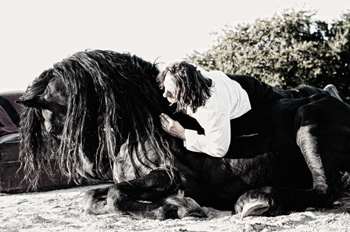 Quel extraordinaire « Chant d’amour » que cette chorégraphie pour un danseur et un cheval, sous une volière géante, dans les jardins de VENERIA REALE. Mais qu’apprivoisent donc l’homme, Thomas CHAUSSEBOURG et le cheval WAR ZAO, sinon l’instant présent, celui de la danse. Une danse motivée par l’effervescence animale du danseur, impressionné par la Bête Noire. L’homme et la bête se stimulent mutuellement mais c’est l’homme qui se met aux genoux de l’étalon, lequel certainement sensible à la musique de BASHUNG, ouvre la danse à son propre rythme tantôt au trot, parfois au galop, très indépendant. Une histoire de couple sauvage qui se raconte à travers quelques mouvements de danse si intenses que dans un éblouissement, le public a pu saisir la musique intime du couple, son mystère, sa vivacité.