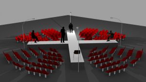 Le podium cruciforme d’une blancheur crue, imaginé par le metteur en scène n’est qu’une assiette plate en somme, une figure géométrique abstraite, virtuelle, un support sans âme qui aimante malgré eux les travailleurs.