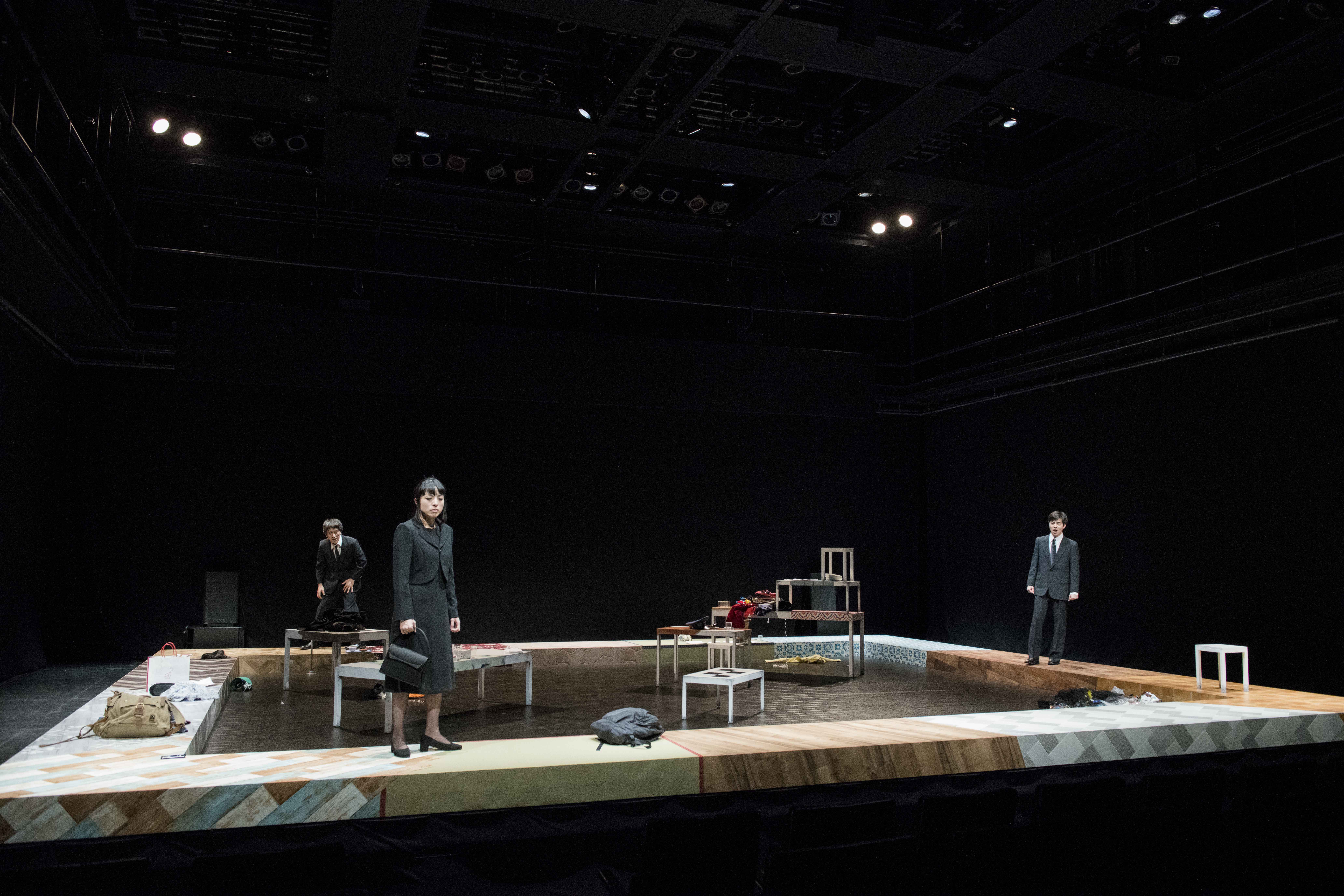 Dans le dispositif scénique de la pièce, Hideto IWAI représente des individus « qui se regardent sans se regarder physiquement ». Tout au long de la représentation, tous les comédiens sont présents en permanence. L’idée est de faire exister sur scène des personnages même absents au présent.