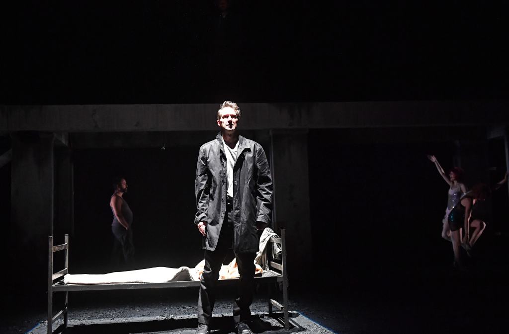La scène est obscure, juste un grand pont la traverse qui suggère l’ailleurs, les autres, la rue , la ville Saint Pétersbourg qui fulmine noyée dans la chaleur et la poisse. En contrebas, éclairé par un projecteur, il y a le lit de Raskolnikov, son drap blanc froissé, une tache de lumière avec ses relents de sueur, de fièvre, d’insomnies.