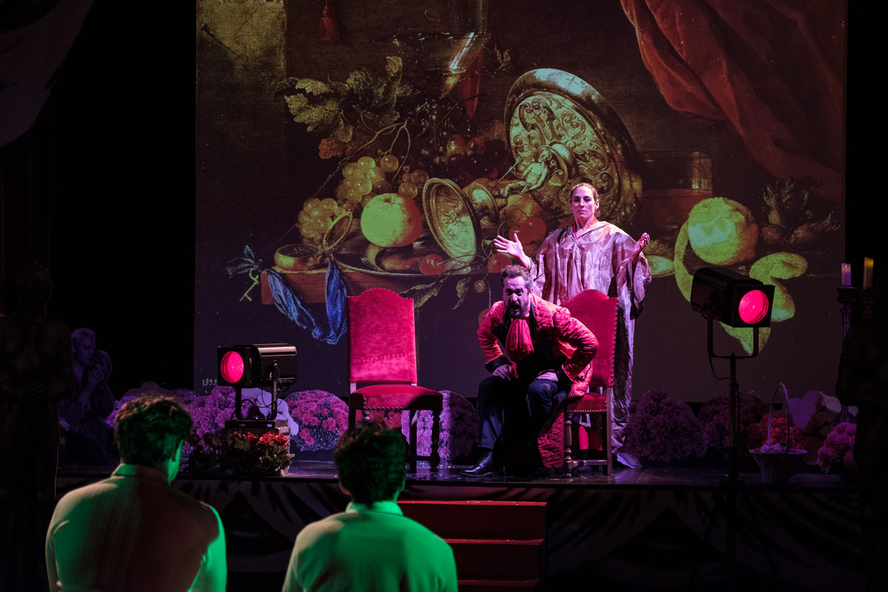 La mise en scène de Jérémie Le Louët, magnifique interprète d’Hamlet, fait penser à un inventaire désordonné et fou que le personnage lui-même aurait culbuté dans un grenier enchanté où pèle mêle se retrouvent les photos des rois et des reines sur papier glacé de Jour de France, l’ambiance désuète et vaporeuse d’un salon de casino, les copies de tableaux de maîtres, les coulisses d’un théâtre musée avec tous ses accessoires et même les silhouettes cartonnées de Victor Hugo et Shakespeare.