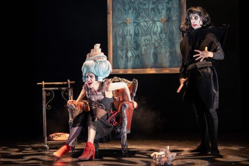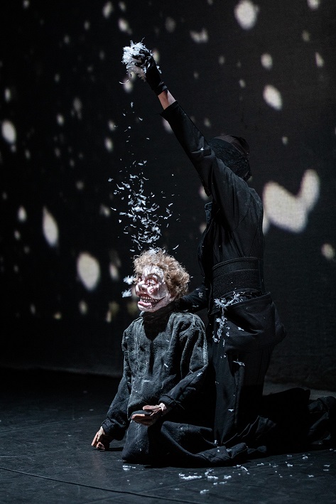 Dans le spectacle qui réunit deux marionnettes celle de Gwynplaine et de Déa et plusieurs comédiens, la metteure en scène Claire Dancoisne s’est visiblement imprégnée de la charge éruptive et baroque du verbe hugolien avec son propre imaginaire où se mêle sa fascination pour les créatures qu’elles soient objets, humaines ou marionnettes.