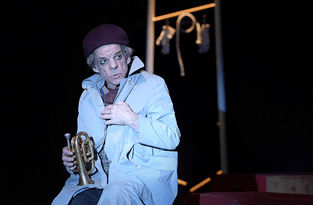 Sur scène, nous avons le privilège de voir un clown qui rêve, qui grimpe sur l’échelle d’un rêve pour attraper la lune et tombe plusieurs fois. Denis Lavant le représente,