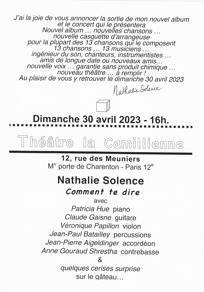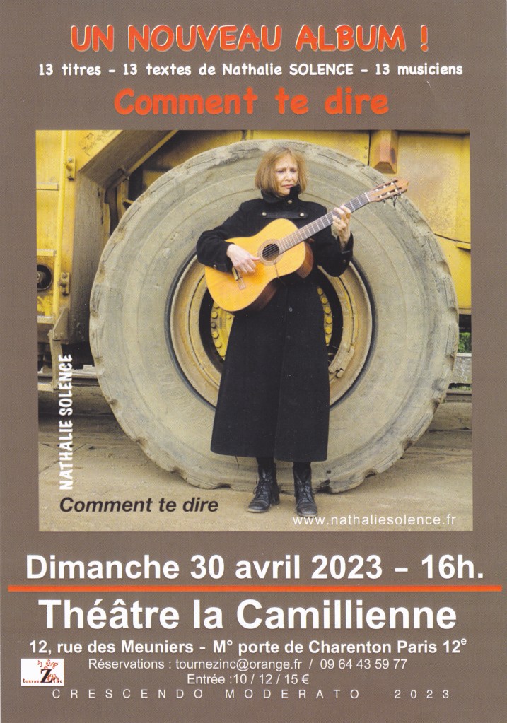 Concert de Nathalie SOLENCE au Théâtre LA CAMILLIENNE 12 Rue des Meuniers 75012 PARIS le Dimanche 30 Avril 2023 à 16 H.