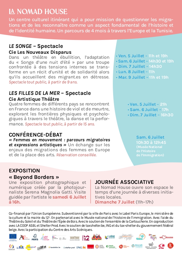 Du 5 au 9 Juillet 2024, la Nomad House sera présente à Paris ; il s’agit de proposer au public un ensemble d’évènements artistiques gratuits entre spectacles, conférence débat, exposition photographie et journée associative. Les actions auront lieu à la Cartoucherie, le Centre Culturel Itinérant avec son chapiteau et le spectacle Le Songe s’installera sur le parking, avec l’aide du Théâtre du Soleil. le Théâtre de l’Epée de Bois accueillera le spectacle Les filles de la Mer. L’exposition, le bar et la journée associative auront lieu autour du chapiteau.