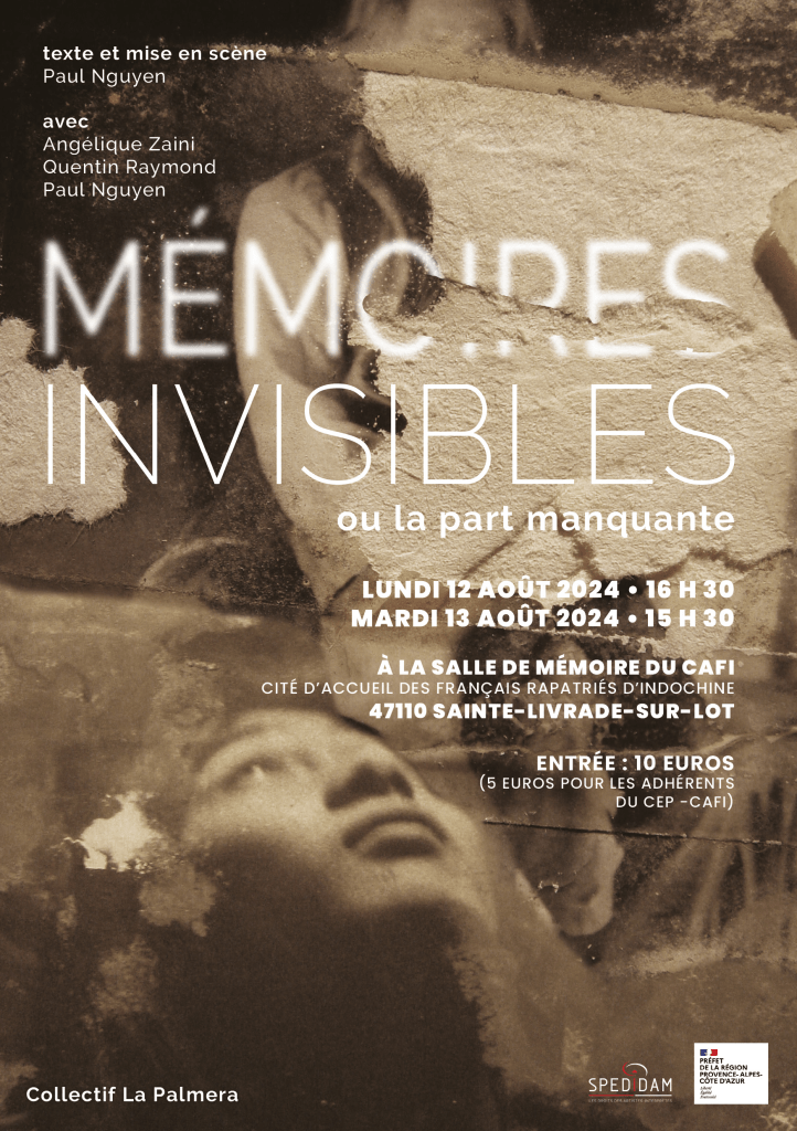 | 12 & 13 AOÛT 2024 AU CAFI 2 DATES EXCEPTIONNELLES Dans le camp qui a accueilli les rapatrié.es d’Indochine en 1956, dont la grand‑mère de Paul Nguyen.Lundi 12 août 2024 • 16 h 30 – Mardi 13 août 2024 • 15 h 30 à la salle de mémoire du cafi – Cité d’Accueil des Français rapatriés d’Indochine 47110 Sainte-Livrade-sur-Lot – Voir sur google maps Entrée : 10 euros(5 euros pour les adhérents du CEP -CAFI) Comment se construire, partagé entre deux cultures ? |