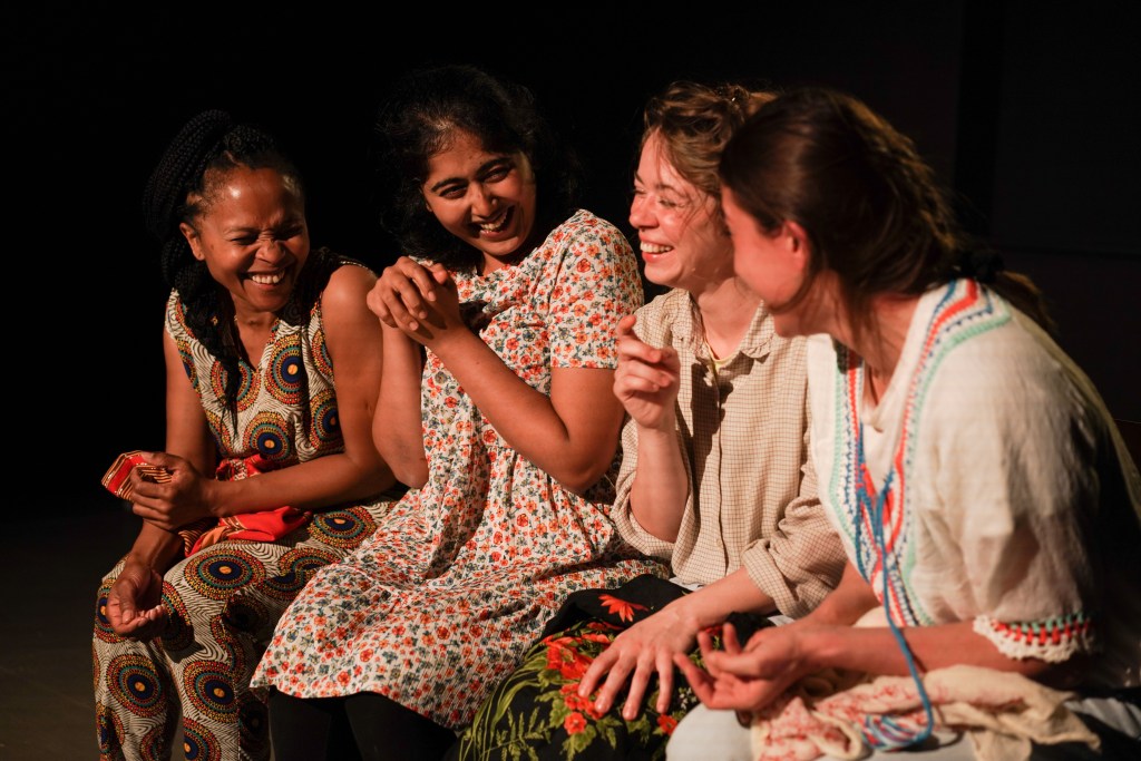 La belle idée de ce spectacle est de réunir quatre comédiennes d’horizons et cultures différentes, qui au départ ne se connaissaient pas, pour incarner des migrantes malgré elles qui se rencontrent au bord du monde, sans que l’on sache précisément s’il s’agit d’une frontière d’un camp de migrants ou la rue, « ici ou là-bas ».