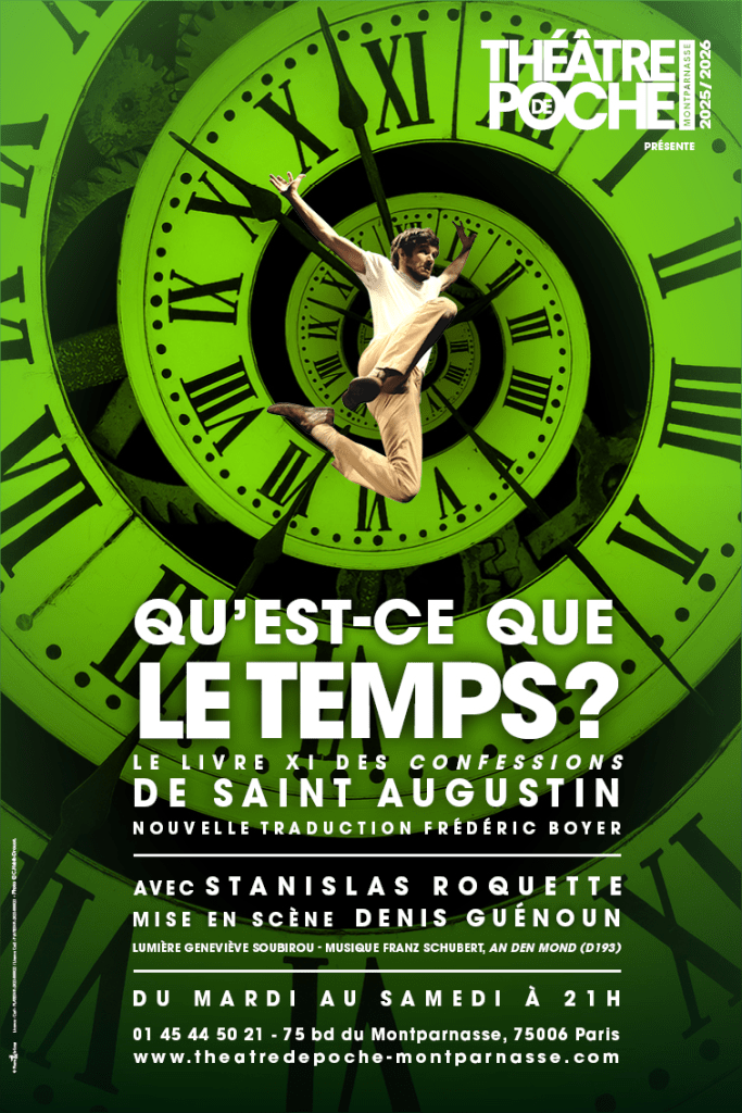 Dans le Livre XI des Confessions – un classique de la pensée philosophique – saint Augustin pose une question à la fois simple et vertigineuse : Qu’est-ce que le temps ? Puis il ajoute : « Si personne ne me le demande, je sais. Si on me le demande et que je veux l’expliquer, je ne sais plus. » Par son incarnation virevoltante, alliant humour et profondeur, Stanislas Roquette met en corps la pensée du philosophe, avec la vivacité d’un grand horloger. Une heure de temps suspendu !