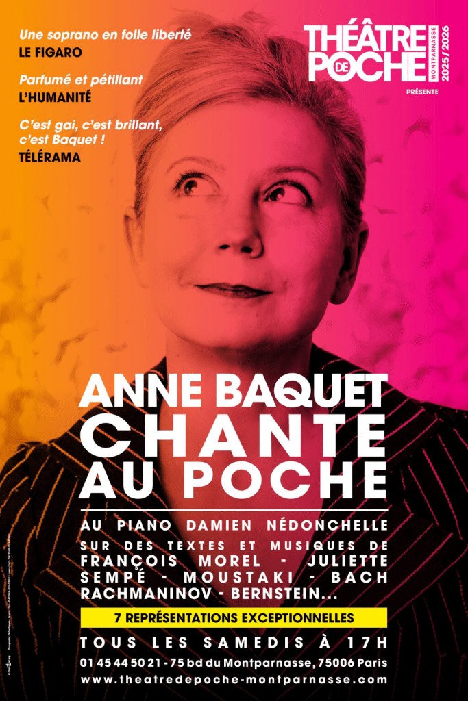 Anne Baquet c’est une chanson douce qui parfois se fait volcan. C’est la musique de la vie qui va et vient. C’est une voix qui dit beaucoup l’air de rien. C’est ce joli clown soprano qui chante Mozart debout sur un piano. La voici de retour avec son pianiste Damien Nédonchelle dans un tour de chant dont elle a le secret.