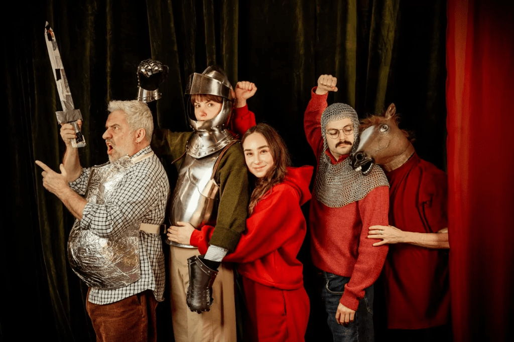 Voilà un spectacle bien festif qui réussit à captiver les enfants qui doivent être éberlués par l’extravagance d’une famille dévouée aux fantasmes d’un vieux monsieur qui se prend pour Don Quichotte. Il s’avère que le papy est atteint d’une maladie dégénérative. Sa petite fille qui l’adore est toute à son écoute car elle refuse qu’il aille en EHPAD.