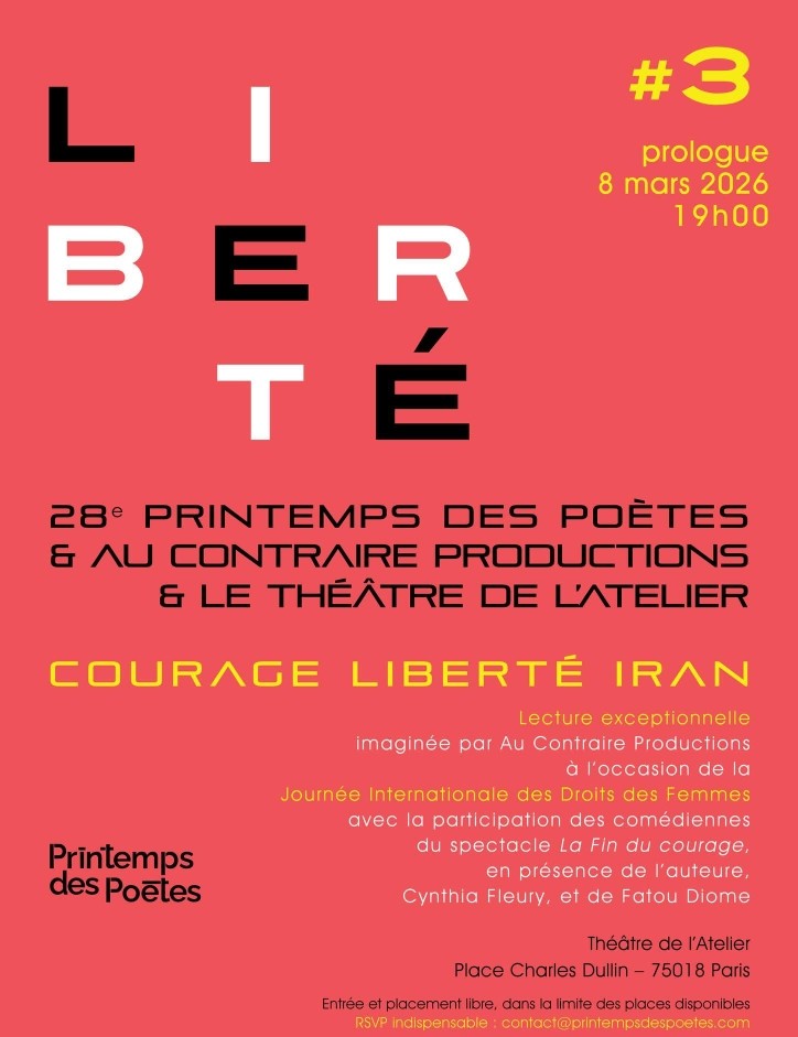 En prologue du Printemps des poètes 2026, à l’issue de la dernière représentation de La Fin du courage de Cynthia FLEURY au Théâtre de l’ATELIER plusieurs comédiennes et un comédien accompagnés de Cynthia FLEURY ont participé à une remarquable lecture de textes et poèmes invoquant le courage, la liberté et l’Iran.