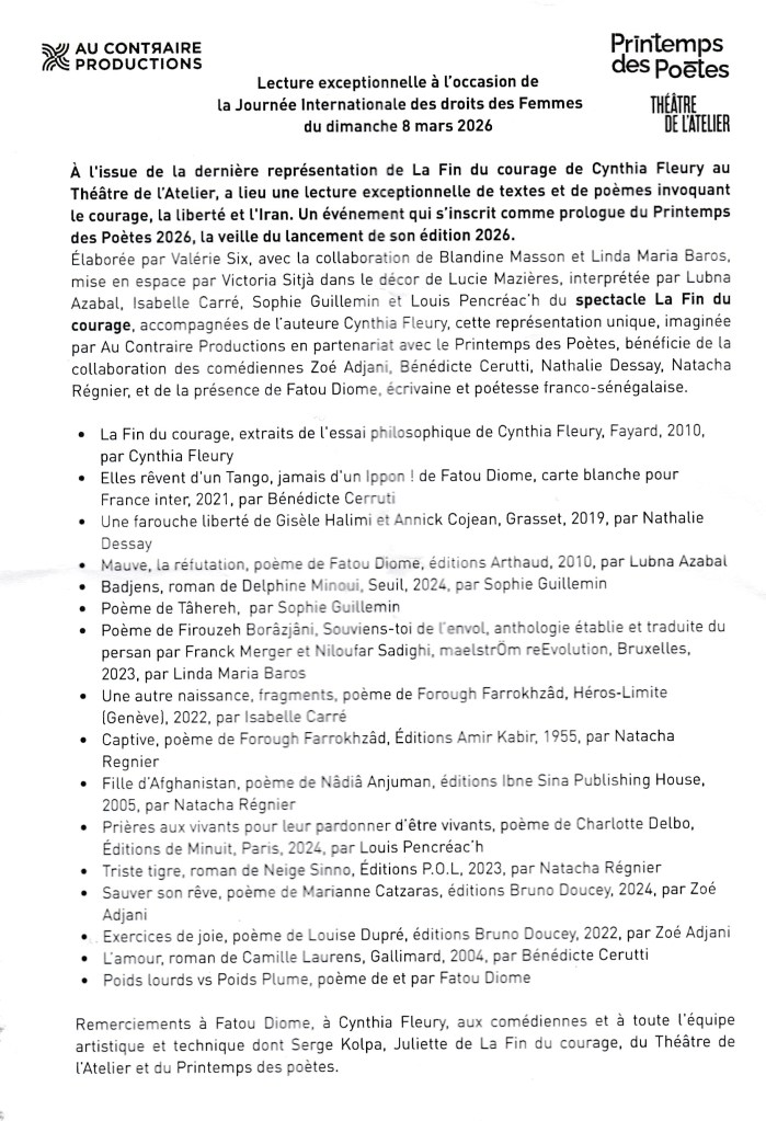 En prologue du Printemps des poètes 2026, à l’issue de la dernière représentation de La Fin du courage de Cynthia FLEURY au Théâtre de l’ATELIER plusieurs comédiennes et un comédien accompagnés de Cynthia FLEURY ont participé à une remarquable lecture de textes et poèmes invoquant le courage, la liberté et l’Iran.